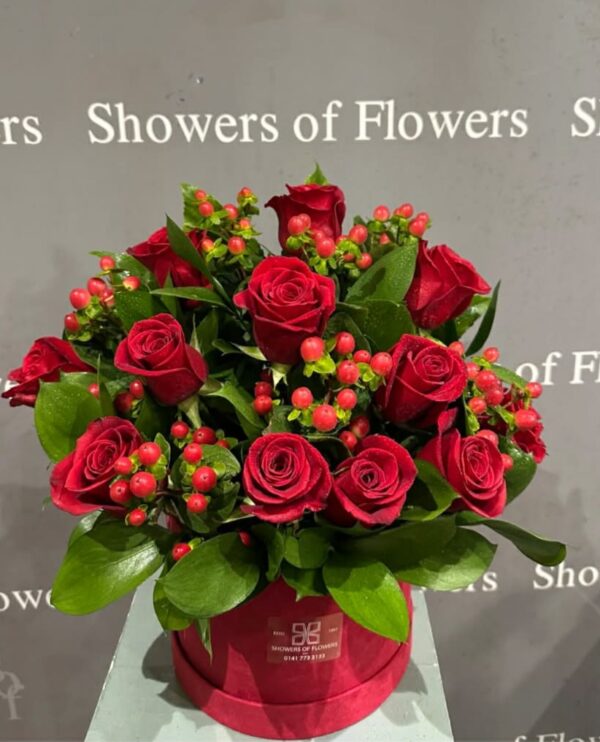 A stylish hat box arrangement of a dozen roses with complimentary foliages and fillers. Choose from a range of colours.